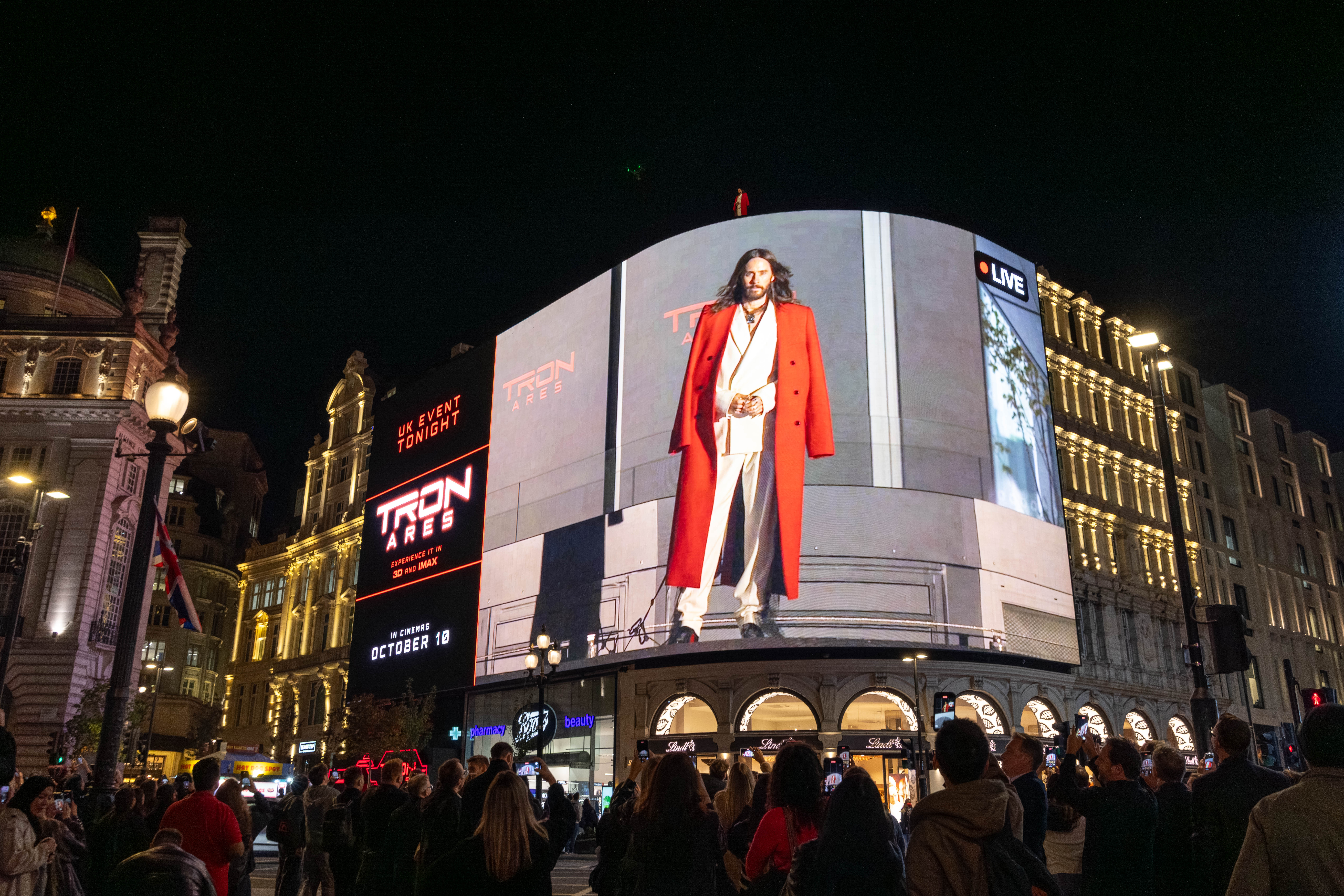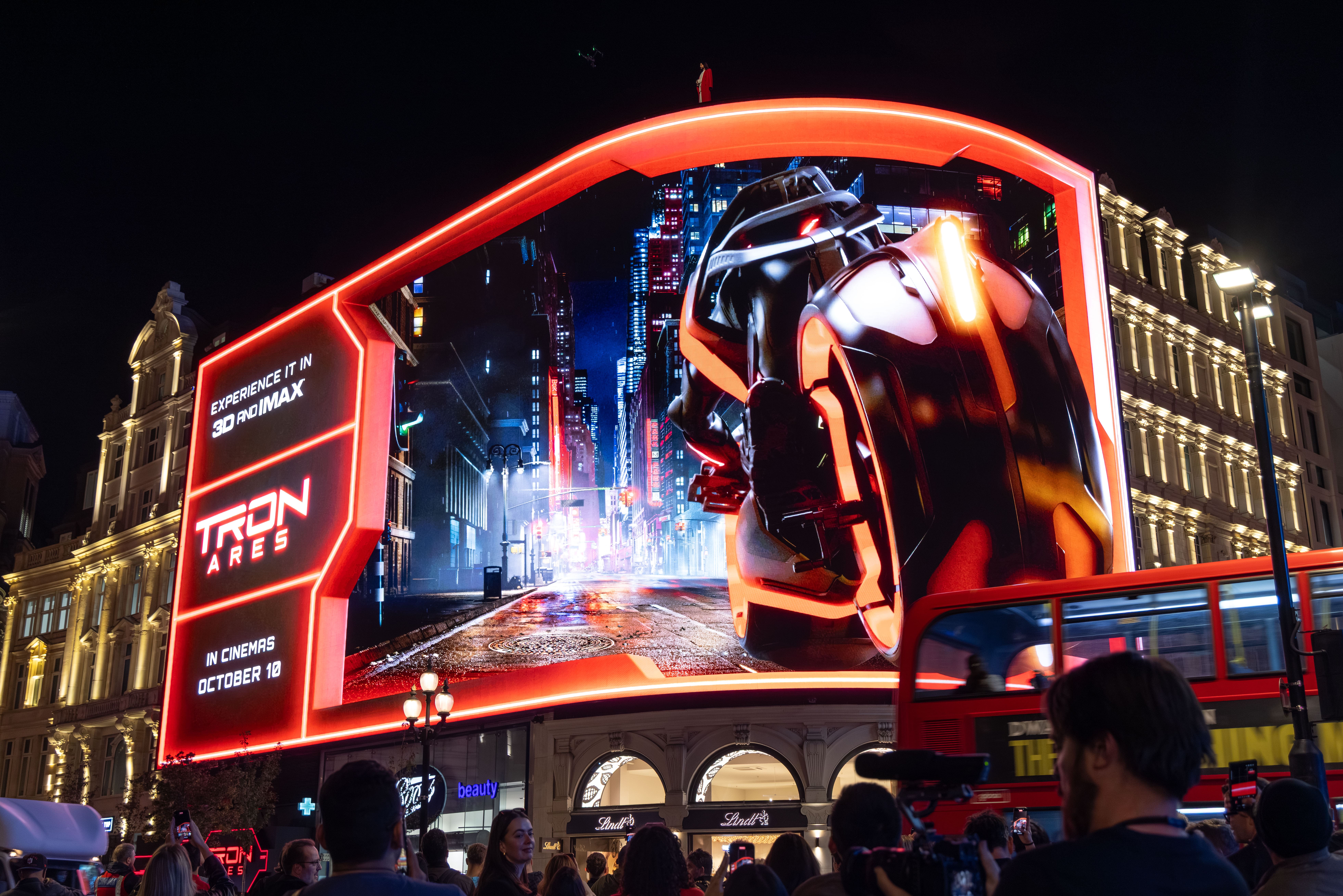 For Tron: Ares, Disney dared to transform Piccadilly Lights into a stage of cinematic audacity. As night fell, the screen ignited with DeepScreen® visuals, while up above, Jared Leto scaled the building’s edge in a rooftop stunt streamed live to the square. Below, The Venue became a fan-immersive launch event, complete with LED corridors and a Lightcycle photo moment. To complement the spectacle, partner brands (Samsung, Ducati, IMAX and more) joined with Tron-themed creative in a unified city takeover.